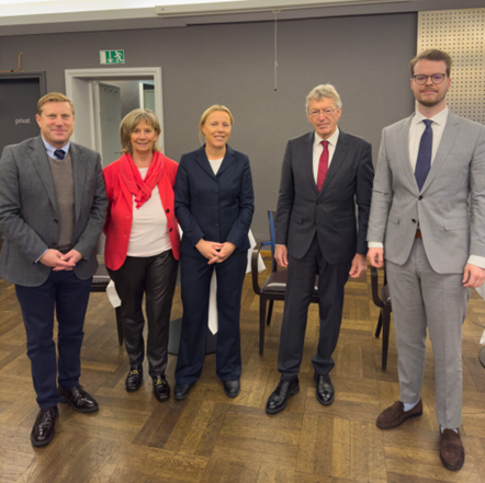 Unter dem Motto „Wehrhafter Rechtsstaat – Wie resilient ist die dritte Gewalt?“ drehten sich der Impulsvortrag von Prof. Dr. Michael Eichberger, Richter des Bundesverfassungsgerichts a. D., sowie die anschließende Podiumsdiskussion mit Sintje Leßner, Präsidentin des Landesjustizprüfungsamtes und Richterin am Verfassungsgerichtshof Baden-Württemberg, sowie Nico Weinmann MdL, rechts- und medienpolitischer Sprecher der FDP/DVP-Fraktion im Landtag von Baden-Württemberg, unter der Moderation von Simon Schlicksupp um die Krisenfestigkeit der Verfassungsgerichtsbarkeit und (gescheiterte) Richterwahlen in Bund und Land sowie die Resilienz der Justiz insgesamt bis hin zur Justizausbildung.